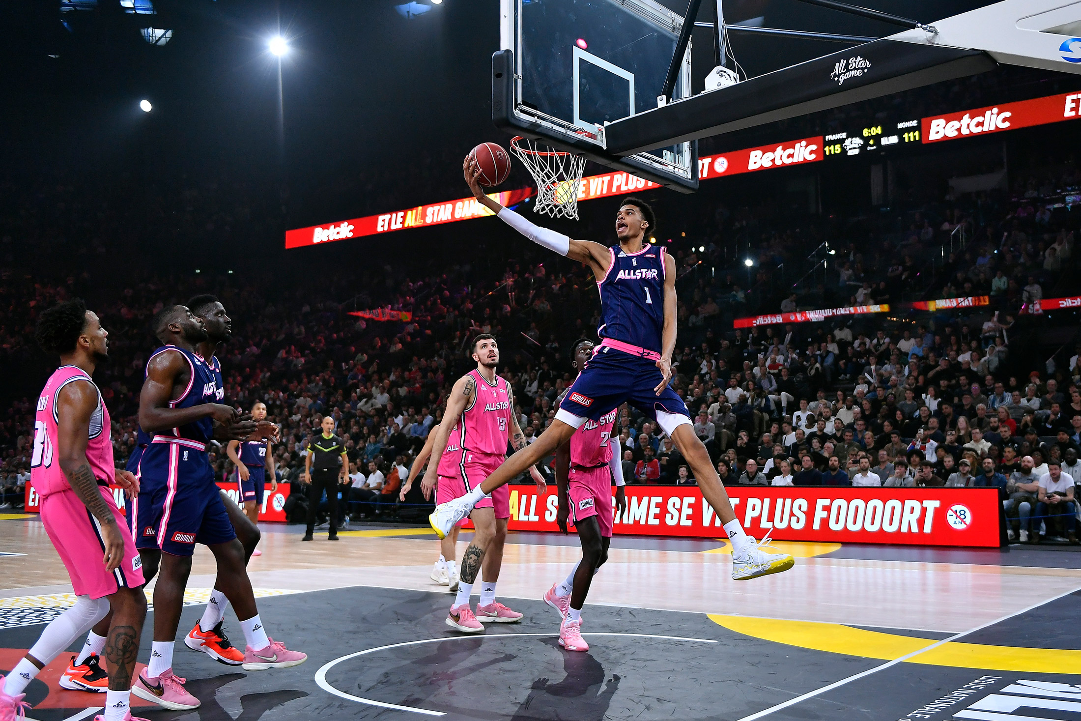 Wembanyama,法国全明星队的成员,在2022年12月的法国国家篮球联赛全明星法国队对全明星世界队的比赛中扣篮。摄影师:奥雷利安·默尼尔/盖蒂图片社### 走向全球