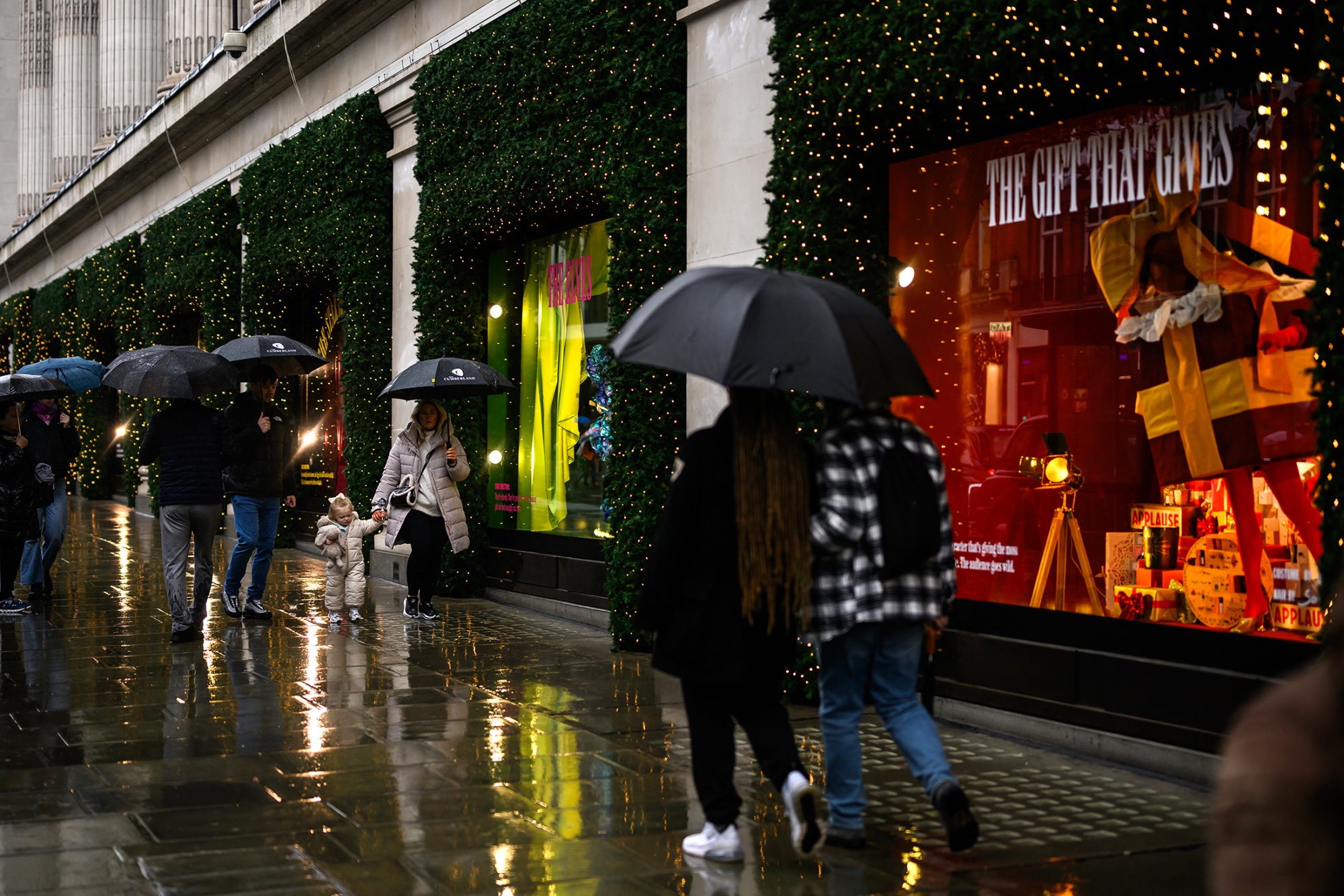 购物者躲避雨水,走在伦敦的牛津街上,日期为12月19日。摄影师:Leon Neal/Getty Images有记录以来最潮湿的十二月可能会对英国零售商造成打击,因为在圣诞节前,参观商店的人数减少了。