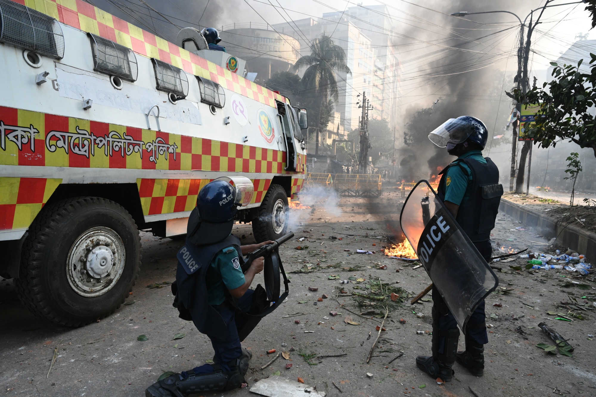2023年10月,警察在达卡举行的要求谢赫·哈西娜辞职的抗议集会上。摄影师:Mamunur Rashid/NurPhoto/Getty Images哈西娜在周四的电视讲话中表示,她领导的Awami League政府在三个任期内创造了稳定,改善了人民的生活质量。她表示,政府坚持“与所有人友好”的国际原则,并改善了国内的机构以保护自由和主权。