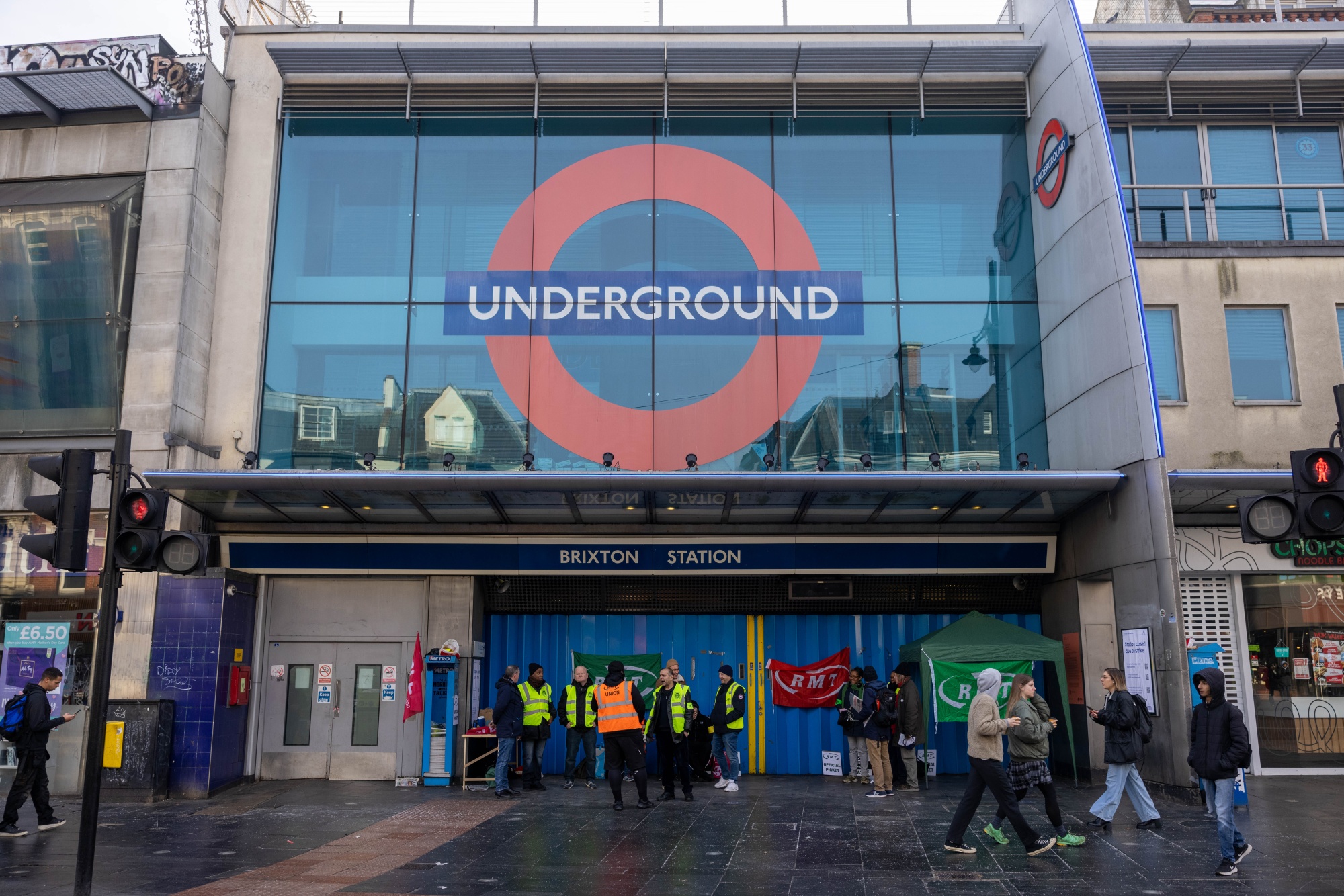 伦敦地铁工人在伦敦的布里克斯顿地铁站外。