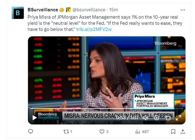当然,如果你只看非农就业报告的话,我们目前还远远没有达到那个水平。但是米斯拉正在发现经济中的许多裂缝,最终将会显现出来并迫使美联储做出一些重大举措。她说,目前来看,只要收益率不跌破4%,10年期国债就是一个买点。