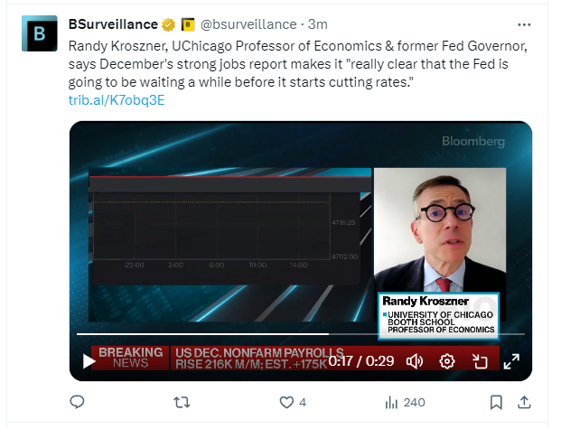 首先,你从发布一些不那么重要的经济报告开始,显示出一些美国经济的实力。然后,你以一份繁荣的非农就业报告结束这一周。相对于经济学家预测的17.5万个工作岗位,美国在12月新增了21.6万个工作岗位,平均小时工资实际上从去年11月的4%上升到了4.1%。