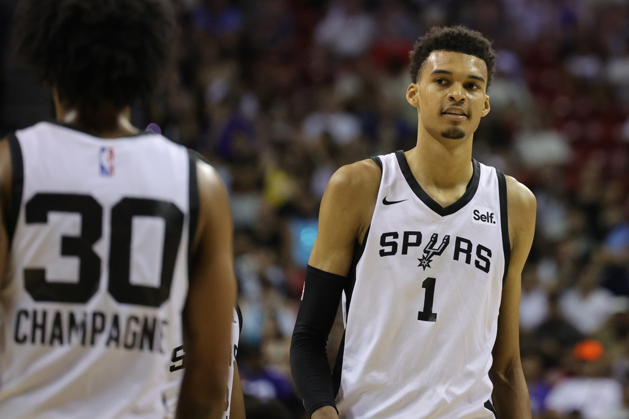 内华达州拉斯维加斯 - 7月7日:圣安东尼奥马刺队的维克多·温班亚马#1在对阵夏洛特黄蜂队的第三节比赛中注视着比赛