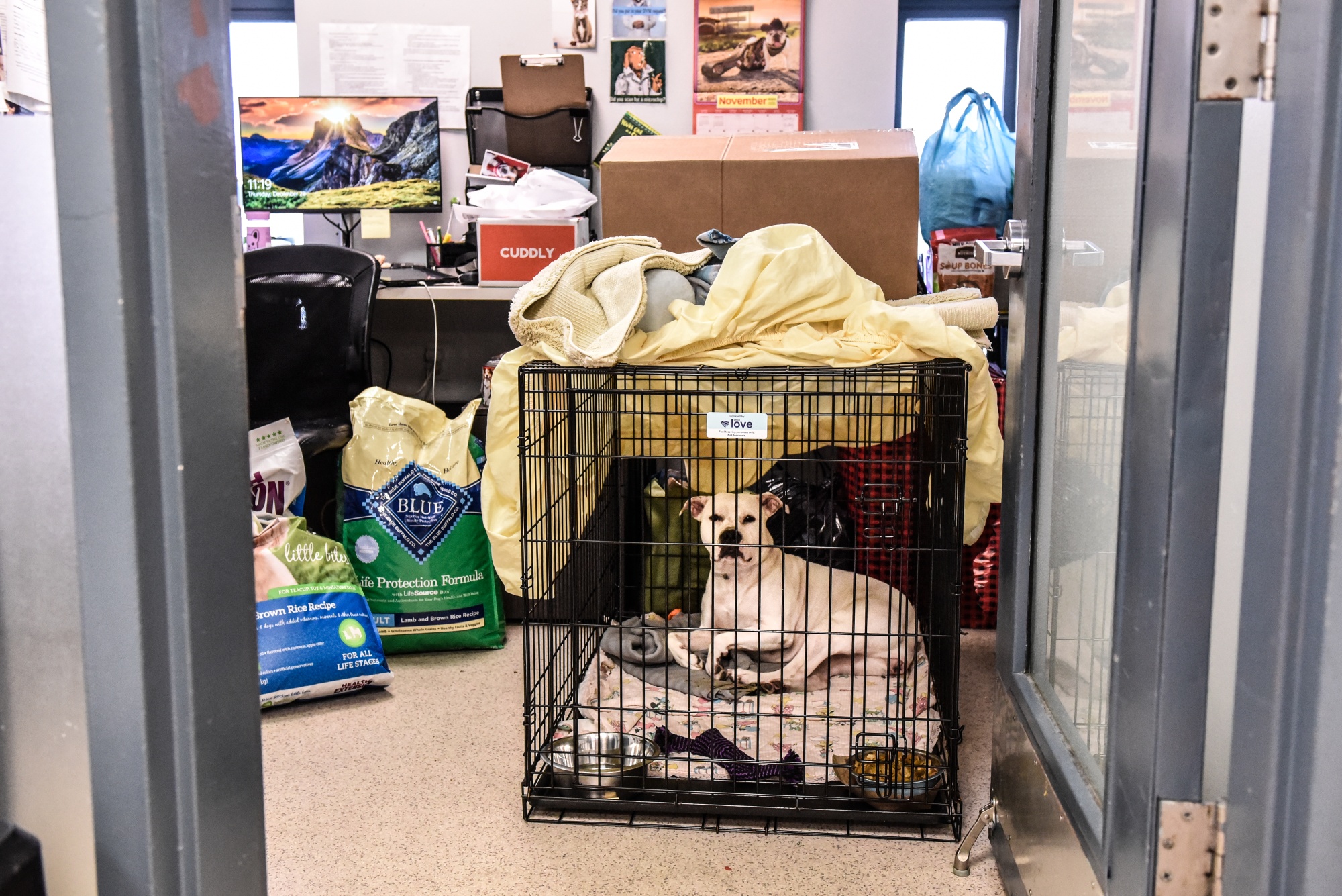 “我们不得不以前所未有的方式创造空间,”纽约市动物护理中心的佐伊·肯尼在十二月表示。尽管收容所再次接收放弃的宠物,但太多的狗导致了大约只有收容所理想大小一半的围栏和在走廊和办公室里临时搭建的狗舍。
