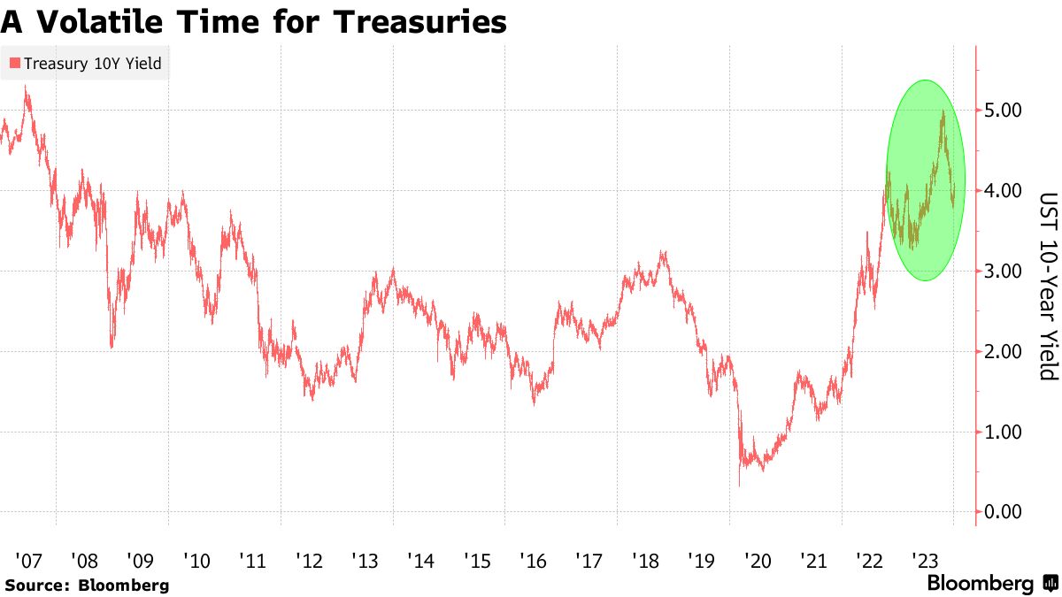 2023年,10年期收益率在3.25%至5.02%之间波动,超过5%的水平-尽管勉强-是自2007年以来首次出现。ICE BofA MOVE指数,该指数衡量特雷asury期权的波动性,达到了16年前全球金融危机以来的最高水平。