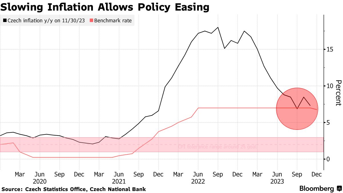 布拉格的决策者们于12月21日首次在三年多以来降低了借贷成本。消费者价格增长急剧下降,预计本月将接近3%,而2022年9月曾达到18%的峰值。即使在降息之后,基准利率的6.75%水平仍然几乎接近近25年来的最高点。