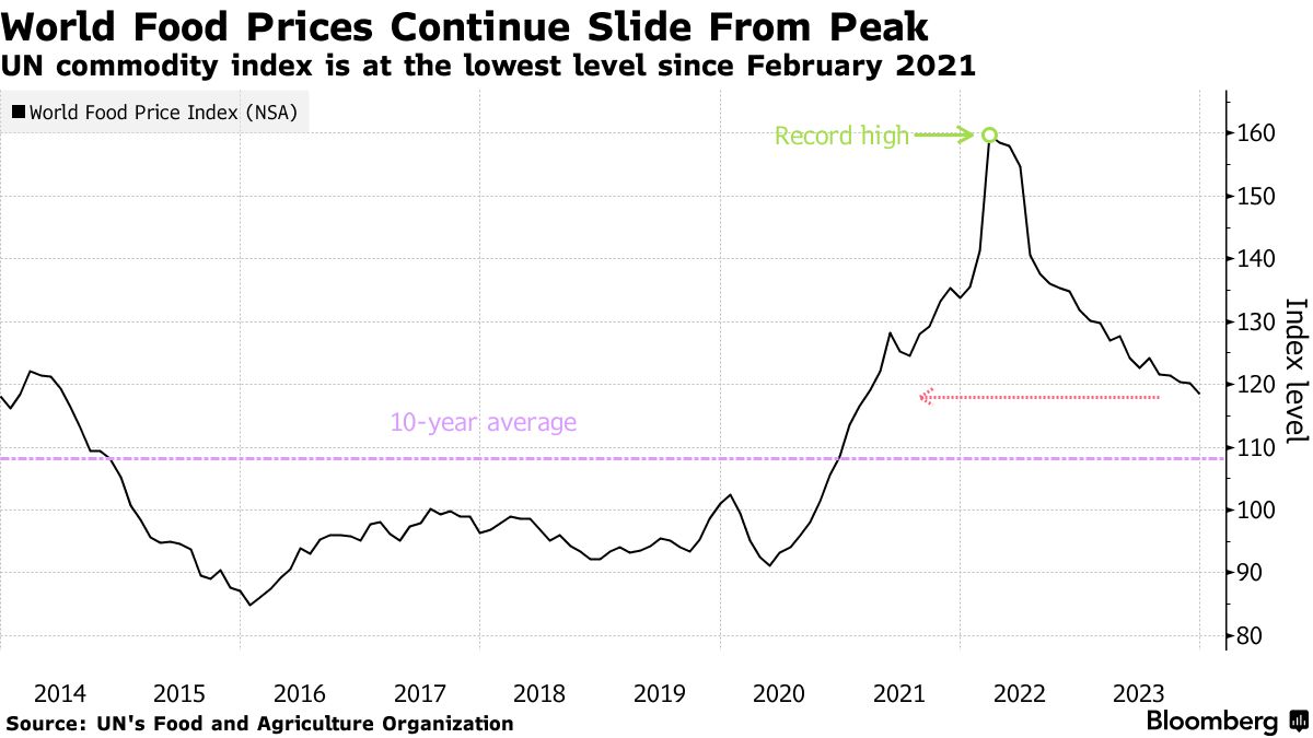 消费者可能会看到一丝缓解。联合国粮食价格指数,该指数跟踪五大出口原材料组的价格,去年下降了10%,目前处于近三年来的最低水平。即便如此,食品通胀仍然是非常真实的 — 该指数仍高于10年平均水平 — 并且这些降价需要时间才能在超市的零售层面体现出来,全球范围内的能源、劳动力和运输成本使得食品价格仍然居高不下。