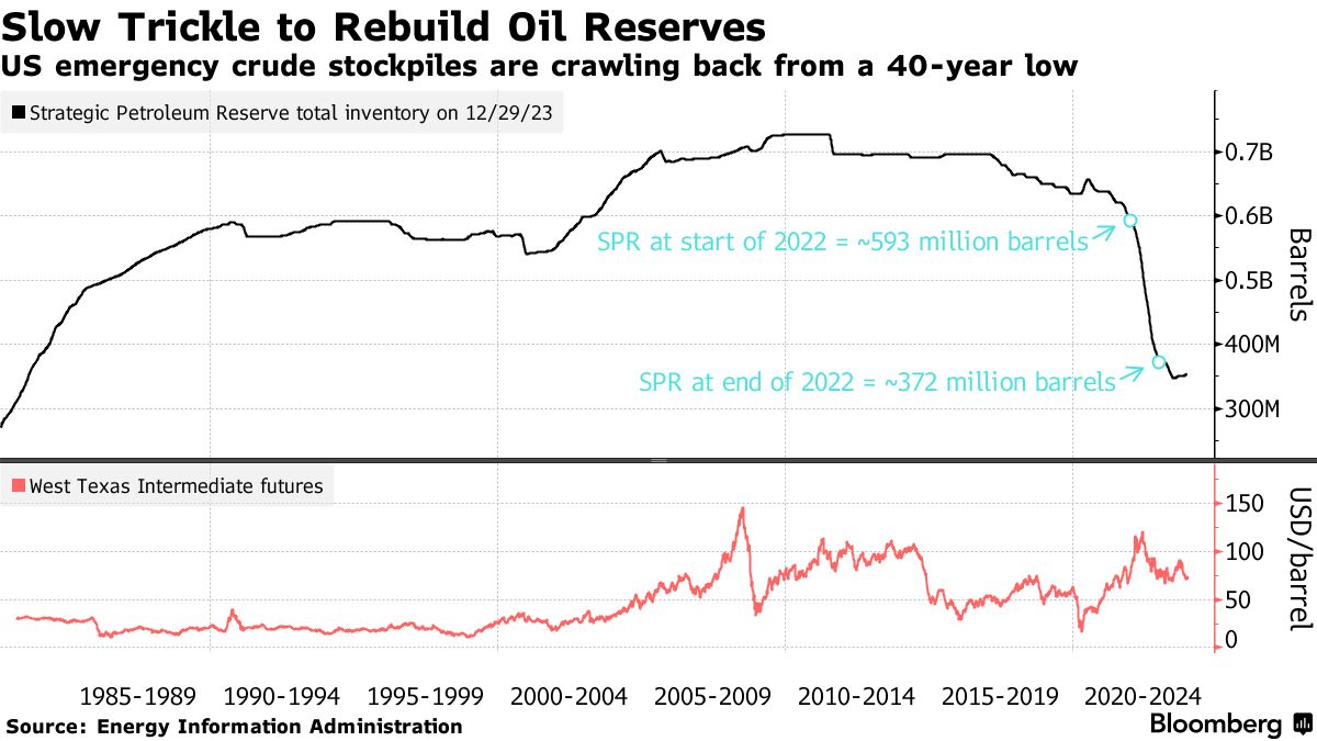 美国能源部正在缓慢地重新填充战略石油储备,该储备在拜登政府在俄罗斯入侵乌克兰后进行了历史性释放1.8亿桶原油,以试图控制高油价之后于2022年被耗尽。根据能源信息管理局的数据,全球最大的紧急供应储备现在约为3.544亿桶。但随着西德克萨斯中质原油期货在中东紧张局势中上涨,如果价格上涨过高,这将有可能阻碍补充。美国在2022年以每桶约95美元的平均价格出售了数百万桶原油后,以每桶约75美元的平均价格购买了SPR的原油。上周WTI的结算价格为每桶73.81美元。