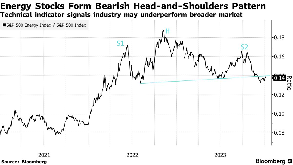根据彭博智库的观点,标普500能源指数持续表现不佳的可能性从技术角度来看正在加强,根据。该指数与更广泛的标普500指数的比率在突破支撑线后形成了一个头肩顶形态 — 形成的颈线 — 在创下三个高点后,中间高点(H)高于其他两个(S1和S2)。这表明进一步下行。该比率需要保持在颈线下方,才能保持熊市图表的完整性。更进一步的压力是,上个月它经历了所谓的死亡交叉,即50日移动平均线低于200日移动平均线。包括埃克森美孚公司、雪佛龙公司和康菲公司在内的23家能源公司的指数在去年下跌了近5%,而在2022年激增了59%。