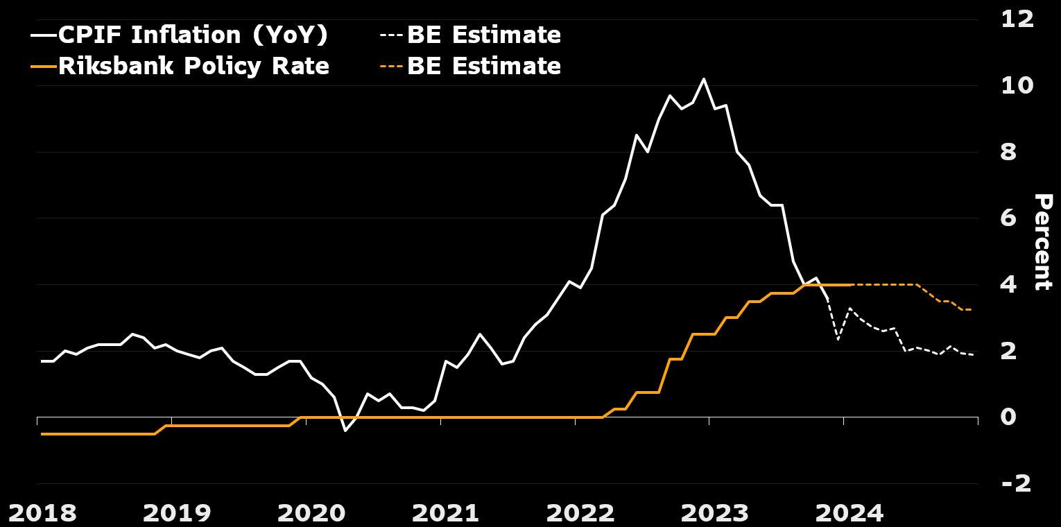 “在4%时,瑞典央行在9月达到了其终端政策利率。它对通胀的战争已经结束 — 我们预计价格上涨将在年中回落至2%的目标,并预计瑞典央行的下一步举措将在8月降息。其他主要央行提前启动宽松周期,或者去年的下行通胀意外再次发生可能会促使在6月尽快降息。”