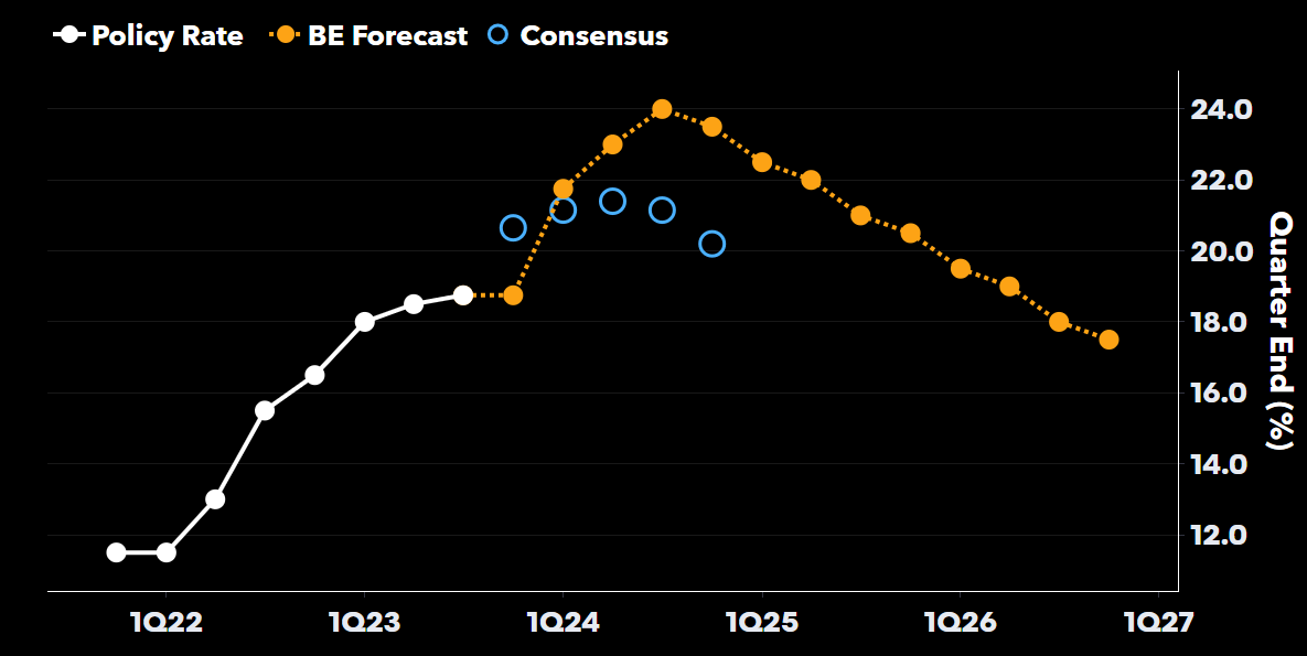 “土耳其央行还没有停止加息。即使在2023年自总统和议会选举以来急转直下之后,它已经将借贷成本提高了3400个基点。我们预计主要利率将从目前的42.5%上升至2024年1月的45%,并将通过改变银行监管等替代工具进一步加紧政策,维持至2024年第三季度。”