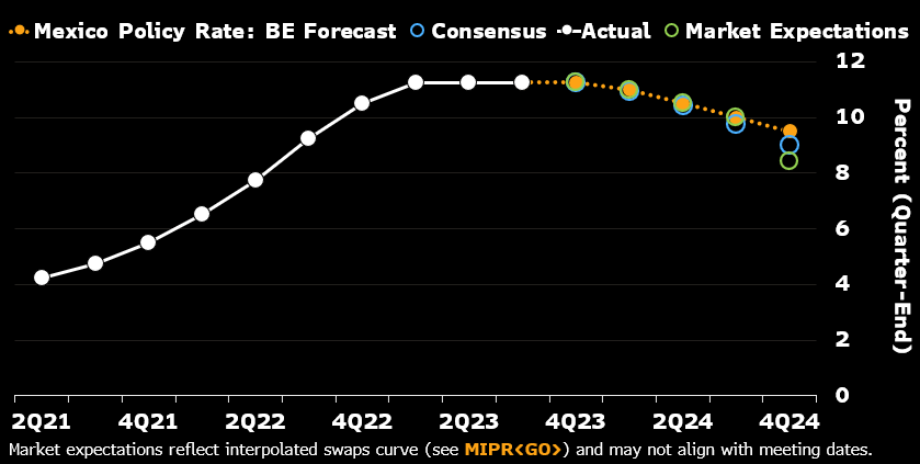 “自从5月份收紧周期结束以来,墨西哥央行将利率维持在11.25%,符合紧缩的货币条件。通胀放缓和预期下降为一定程度的宽松提供了空间,但它们预计将保持在目标之上并限制下行空间。与逐渐缩小的正产出缺口一致的较慢增长也支持逐步调整。美国利率是一个风险。我们预计墨西哥央行将从3月开始缓慢降息,但货币条件在2024年仍将保持紧缩。”