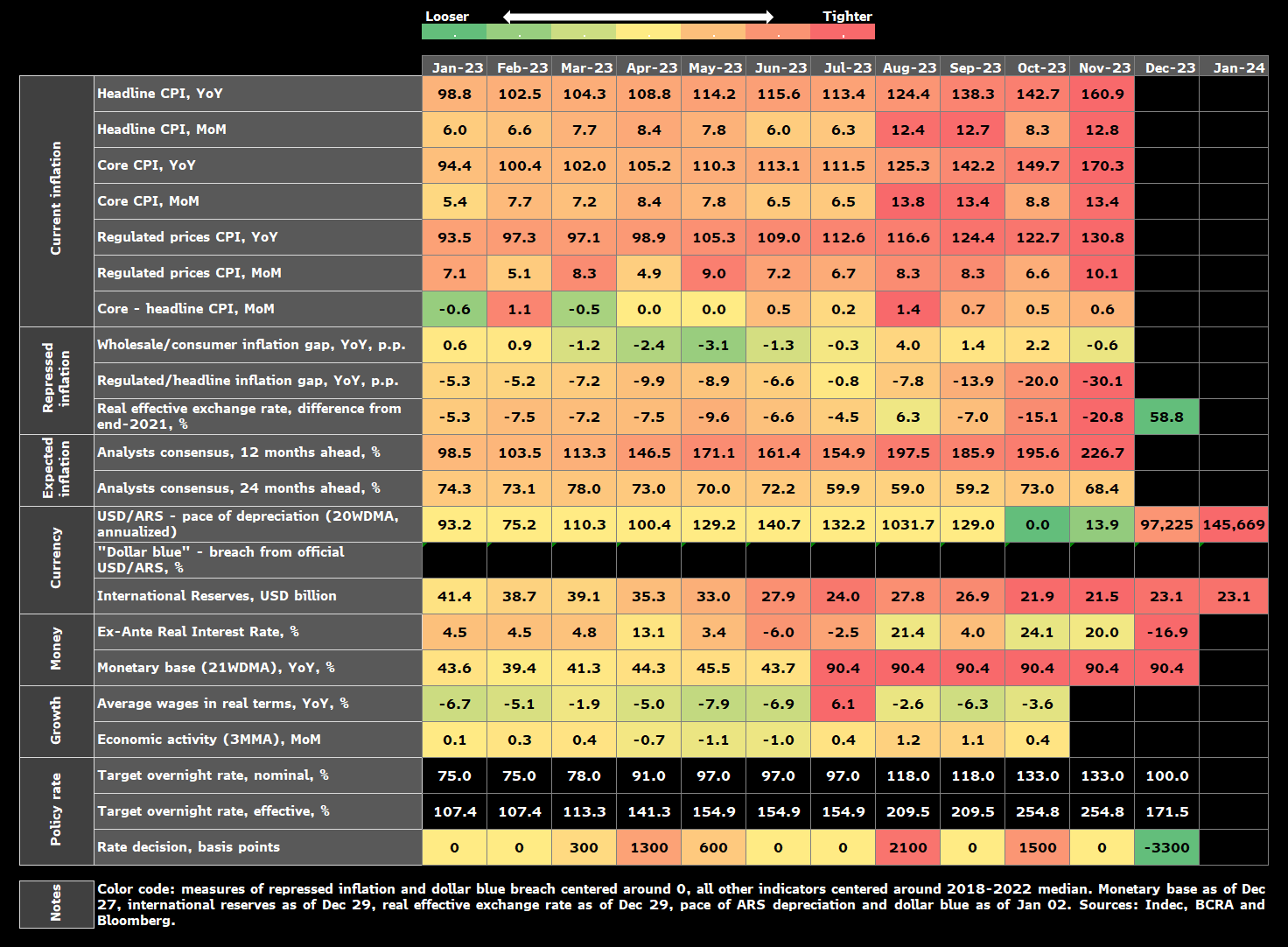 哈维尔·米莱在12月10日上任后彻底改革了阿根廷中央银行的货币政策,贬值了比索,并将基准利率工具从28天债券改为1天回购票据,这意味着将利率从133%降至100%。现由圣地亚哥·鲍西利领导的货币当局还迅速展开了一场外汇储备的迅速回收行动。