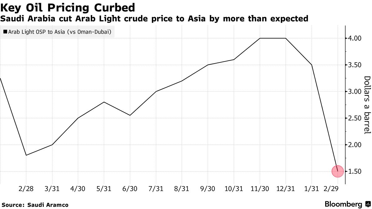 沙特阿美将其旗舰产品阿拉伯轻质原油的官方售价降至每桶比2月份地区基准价格高出1.50美元,为自2021年11月以来的最低水平。这一每桶2美元的降幅超出预期,并且是由于中东原油现货价差疲软,中国需求不振以及全球供应增加。