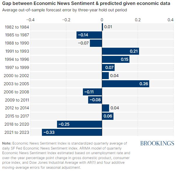 布鲁金斯研究人员寻找了一个模型来解释这一现象,并提出了一个基于四个关键指标的模型:通货膨胀、失业率、国内生产总值增长和股市表现。最后一个指标很重要。股票受到密切关注,而一个上涨的市场将在记者中产生一种感知,无论是有意识的还是无意识的,即经济状况良好。所有这些都使哈里斯和索佐纳能够预测新闻情绪的变化,如果评论员对新的经济数据做出了与过去相同的反应,并将其与实际语气进行比较。换句话说,我们可以看到他们在解释数据时是否变得更加消极,而不仅仅是报道它。他们确实这样做了。研究人员得出结论: