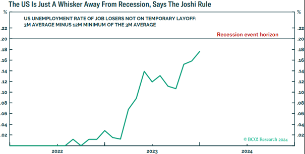 就事论事,这是个好消息,但这似乎意味着美联储在未来10个月内没有必要,甚至没有理由将隔夜利率下调超过一个百分点。然而,失业数据是模糊的。以下是BCA研究的Dhaval Joshi提出的一个与Sahm规则非常相似的不同“规则”: