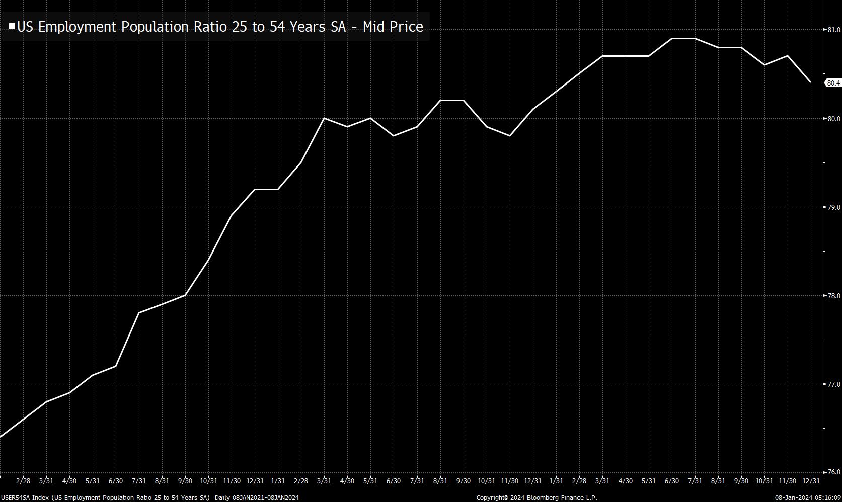 U6等指标、劳动力参与率和主要年龄段就业人口比例都显示恶化。最后一个指标降至去年1月以来的最低水平,如图表所示。
