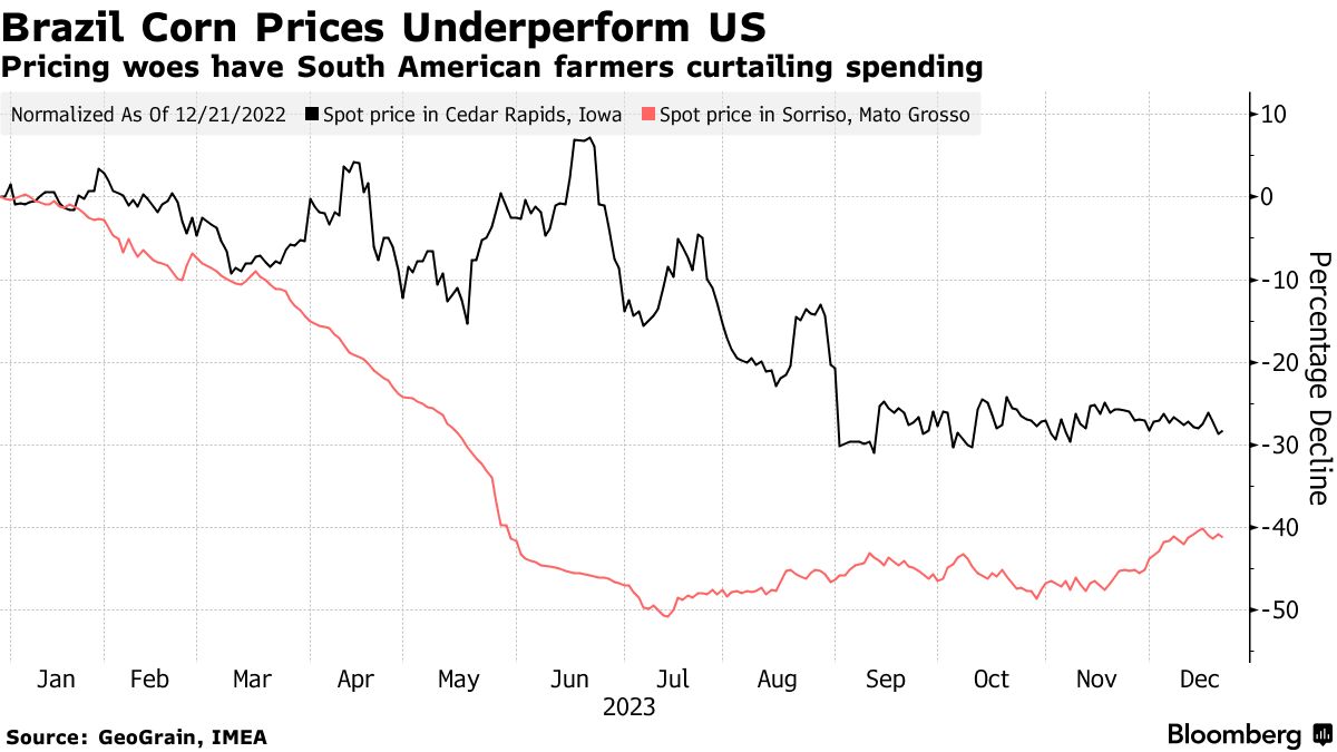 巴西,一个在世界许多关键粮食作物中占主导地位的农业强国,在2023年大部分时间内受到了价格下跌的冲击,比其他全球生产国受到的影响更大。马托格罗索州的玉米价格在实体市场的跌幅比美国最大的生产州爱荷华州还要大。大豆也出现了类似的趋势。