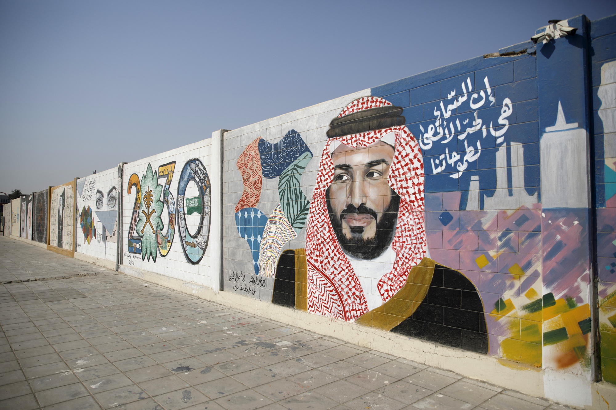 一幅墙上的壁画展示了“2030愿景”标志和沙特阿拉伯的王储穆罕默德·本·萨勒曼在达兰。