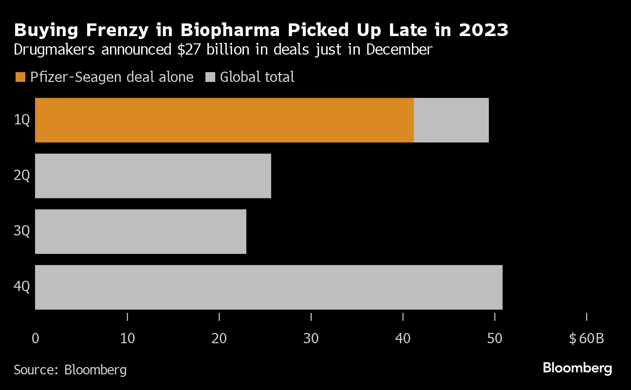 2023年底带来了生物科技交易的狂潮,减肥药公司和靶向癌症治疗公司需求最高。在某些情况下,药企为了获得有前途的疗法支付的价格甚至是公司股价的两倍以上。这是与一年前药企裁员和削减成本形成了巨大反转。