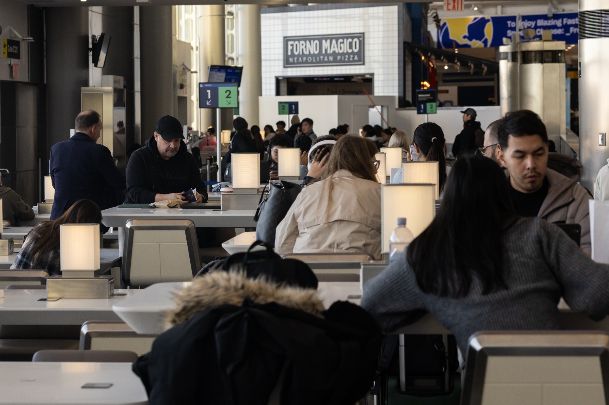 旅客们在新泽西州纽瓦克自由国际机场等待登机,时间是1月8日。周日,美国各地因两股冬季风暴而有数百架航班被迫停飞,纽约哈德逊谷地的积雪超过一英尺,并在大平原地区引发了暴风雪警报。