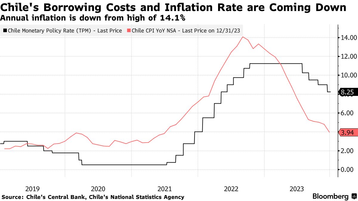 智利的年通货膨胀率目前为3.9%,比2022年8月记录的14.1%的三十年高点下降了超过十个百分点。央行官员预计消费者价格增长将在下半年回到他们的3%目标,尽管许多私营部门经济学家预测它会更早发生。