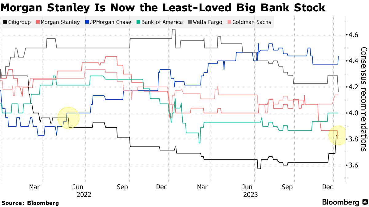 摩根士丹利取代花旗集团成为最不受青睐的大型银行股 - 彭博报道