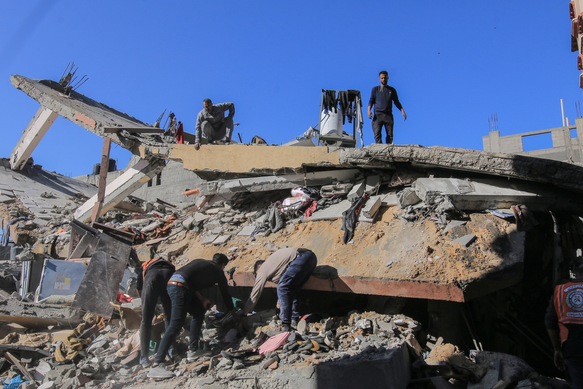 加沙居民在以色列对加沙南部难民营进行空袭后,调查被摧毁的住宅建筑,日期为1月7日