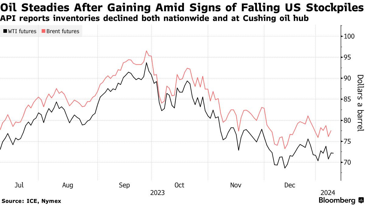 原油在周二上涨超过2%后稳定下来,迹象表明美国库存继续减少,并且官方预测显示今年全球将出现狭窄的赤字。