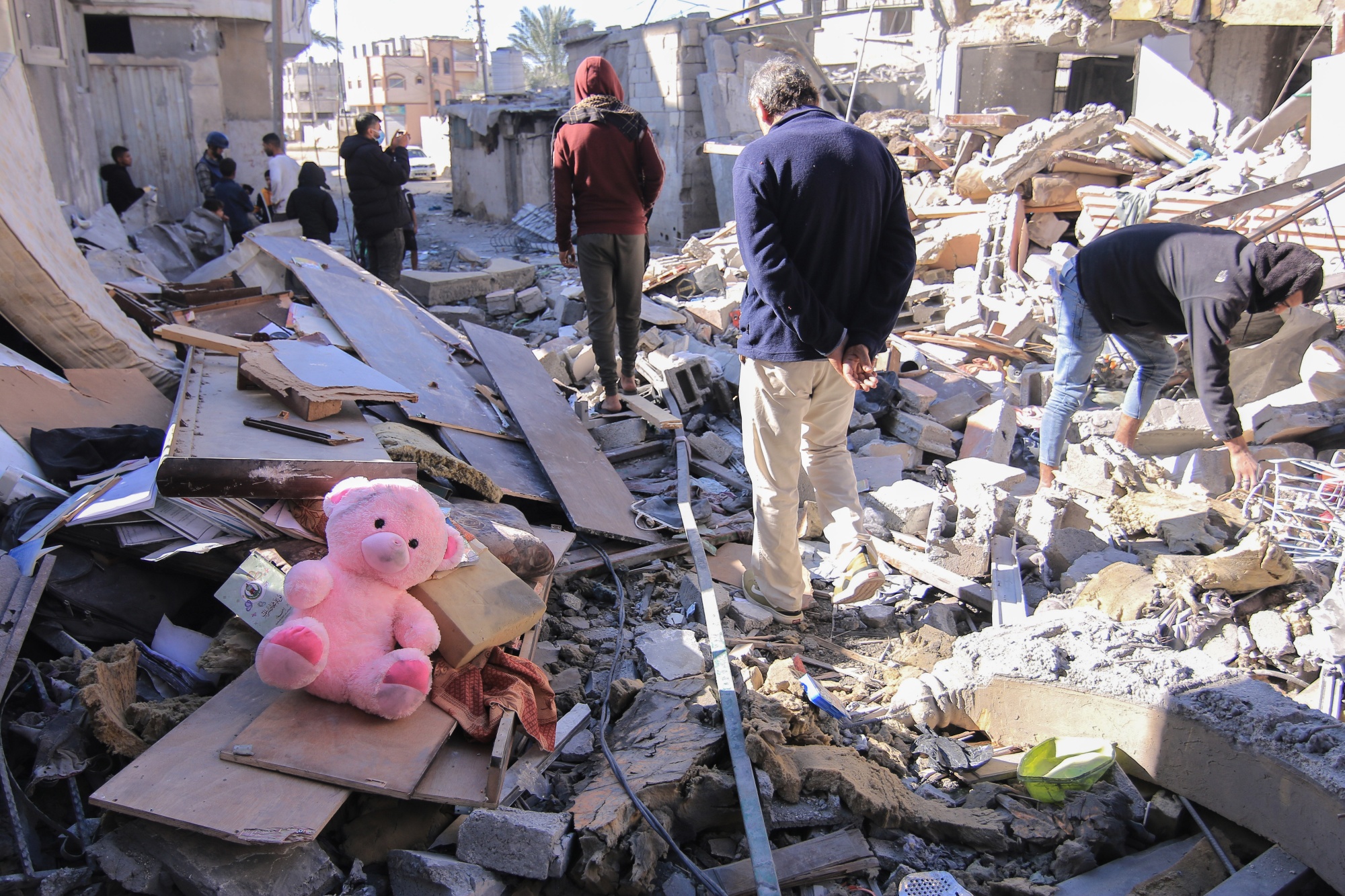 巴勒斯坦人在一次以色列空袭后,走过废墟,检查了南加沙汗尤尼斯西部难民营内居民楼的损坏情况,时间是2024年1月7日星期日。