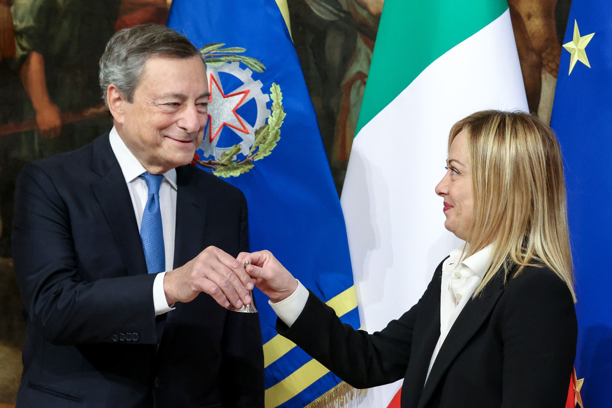德拉吉竟然成为意大利总理乔治亚·梅洛尼的意想不到的盟友。2022年10月,德拉吉将意大利总理在内阁会议上使用的小铃铛交给激动的梅洛尼时,她似乎代表了他的直接对立面。作为右翼意大利兄弟党的领袖,她曾誓言要彻底改革现有体制。