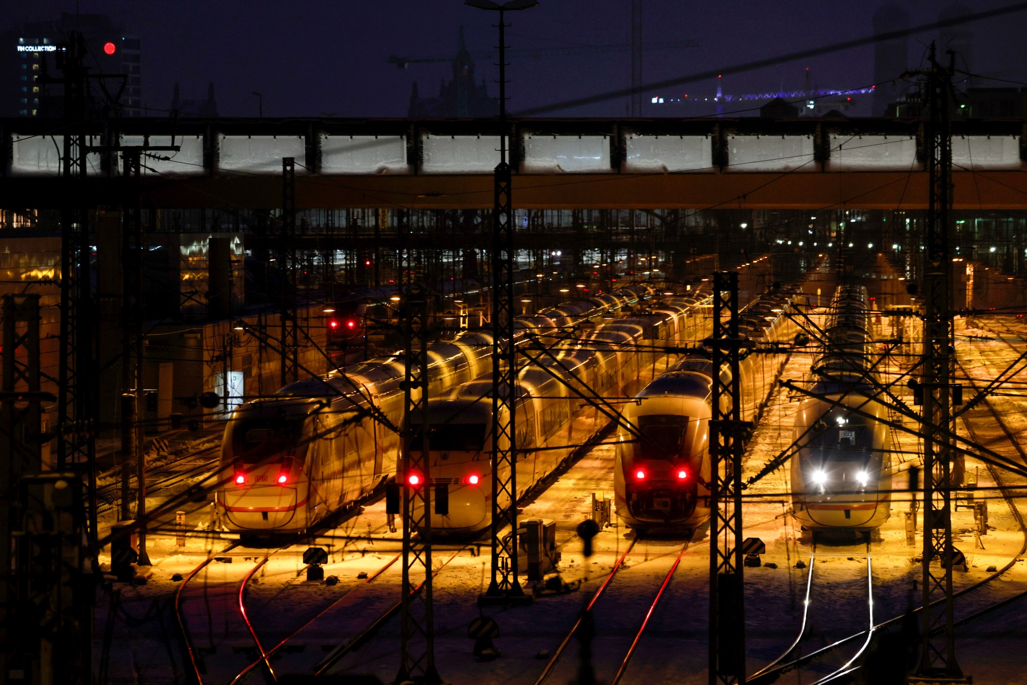在德国慕尼黑,德国机车司机工会(Gewerkschaft Deutscher Lokomotivführer)的成员举行罢工的第一天,静止的客运火车,日期为1月10日。