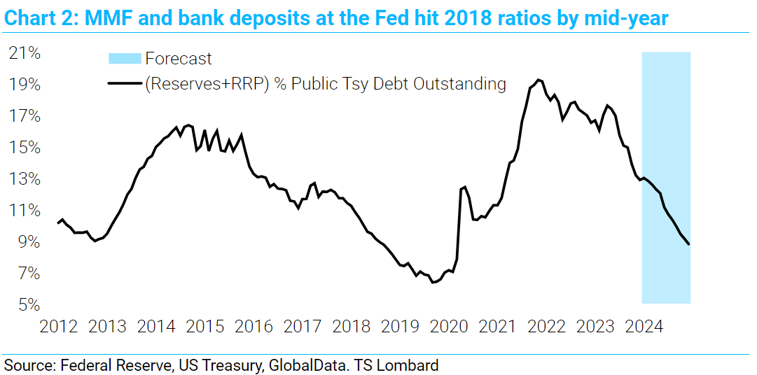 Steven Blitz,TS Lombard首席美国经济学家,建议2018年的流动性比率是一个很好的基准,因为美联储当时放弃了QT在2019年。他使用了一个比较美联储的两个主要流动性负债,即银行准备金和逆回购协议(RRP)(由货币市场基金使用),与公开持有的美国国债的总未偿还金额的指标。