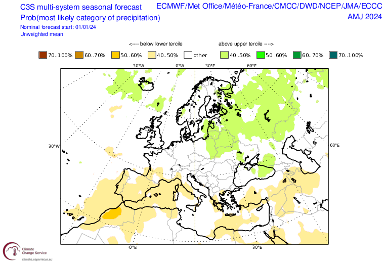 来源:彭博社数据还表明,意大利、葡萄牙和西班牙大部分地区在4月至6月期间有40%至50%的机会降水量明显低于平常。