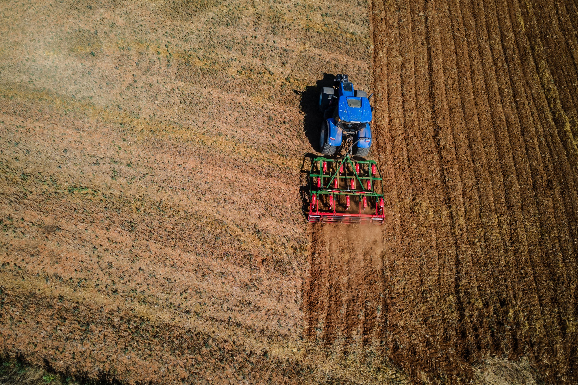一台拖拉机在西班牙赫罗纳的农场上耕地。