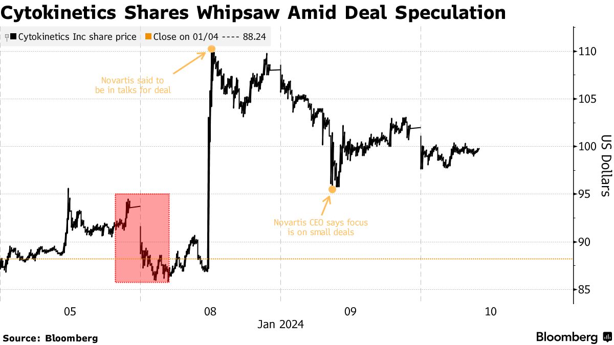 在12月份出现了一批积极的试验数据后,Cytokinetics已经成为了一个备受青睐的收购目标。随后的几周里,由于多份买家感兴趣的报告,股价飙升了近200%。但是当一个关键会议——摩根大通医疗健康大会,一个交易的圣地——开幕时,出现了一连串的交易,但没有人对Cytokinetics发出收购要约,股价开始下跌,直到新的传闻再次点燃了希望,然后再次破灭。