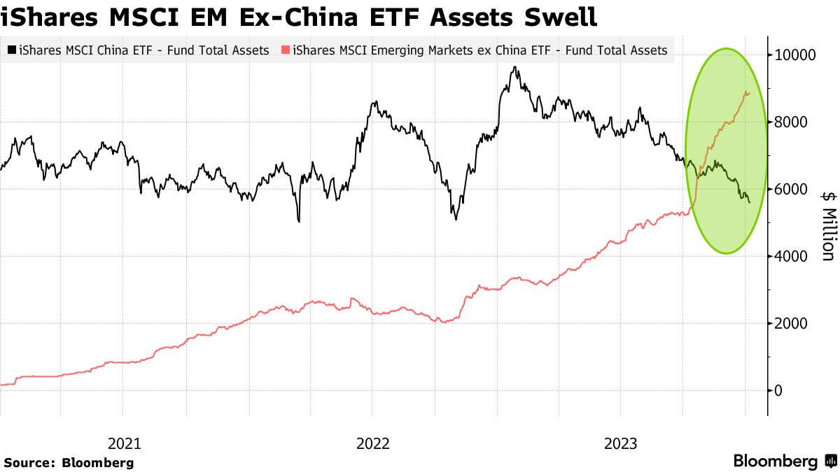 随着中国的疲软,除中国以外的投资蓬勃发展。彭博社编制的数据显示,2023年没有中国投资的新兴市场股票基金数量达到了19只,而2022年为15只,2020年仅为1只。