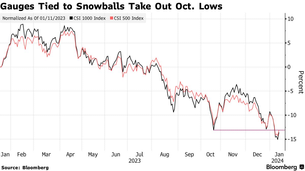 中国的CSI 300 基准到目前为止已经下跌了约4%,延续了去年11%的跌幅。与滚雪球大多挂钩的CSI 500和CSI 1000指数周三收于自2020年4月和2022年4月以来的最低水平。