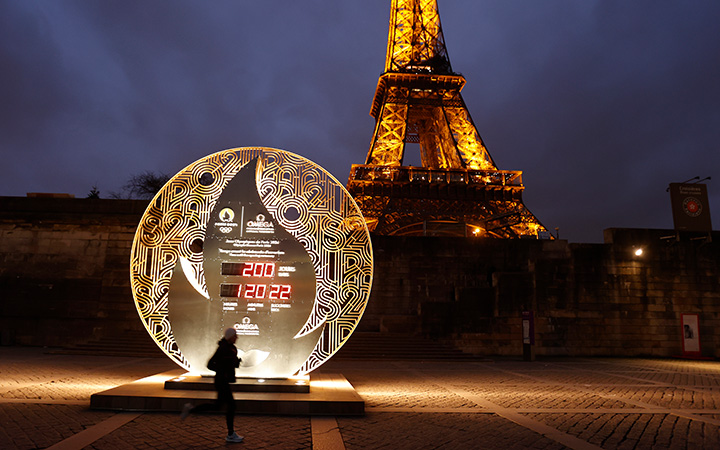 官方奥米茄奥运倒计时钟显示了距离2024年巴黎奥运会开幕式的剩余天数,2024年1月8日在巴黎展出。