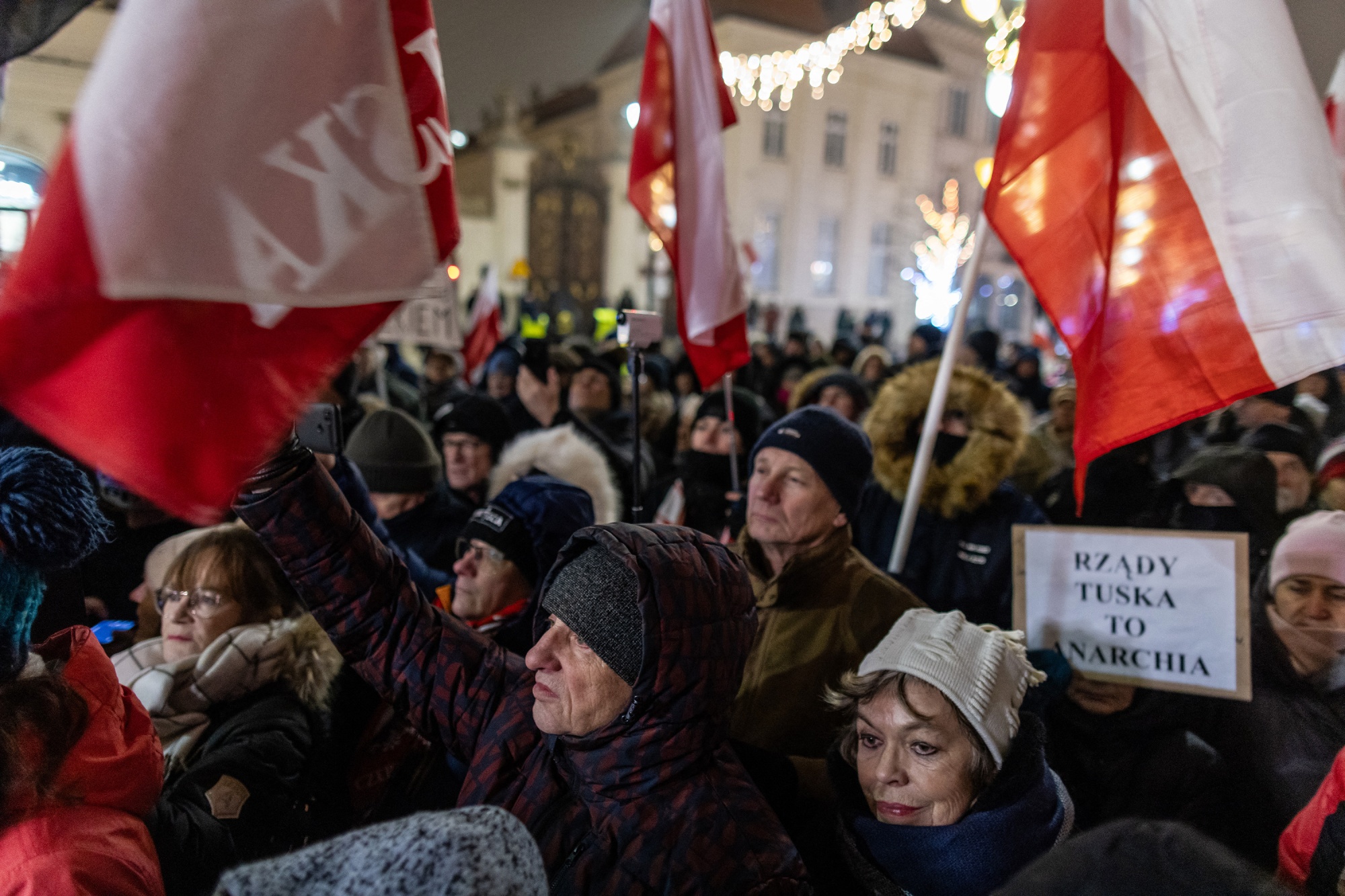 法律和正义党的支持者在华沙示威,支持前内政部长马里乌什·卡明斯基和他的副手马捷·瓦西克在1月10日被捕。