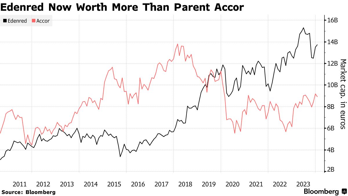 Edenred与Pluxee进行了特别有吸引力的比较。这家在欧洲泛欧洲交易所上市的员工福利公司在分拆后的十年内超过了其母公司雅高集团的市值。现在,Edenred的估值为139亿欧元,而拥有索菲特和伊比斯品牌的雅高集团的市值为89亿欧元。