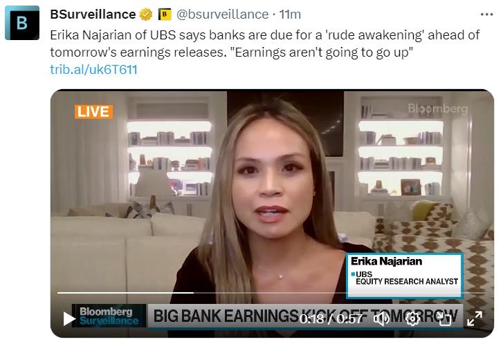 话虽如此,她对华尔街将从行业中听到什么并不乐观,预测“盈利将迎来一个令人不快的觉醒”。纳贾里安表示,上一季股票暴涨23%,投资者只是在消除银行对债券组合未实现损失的风险。
