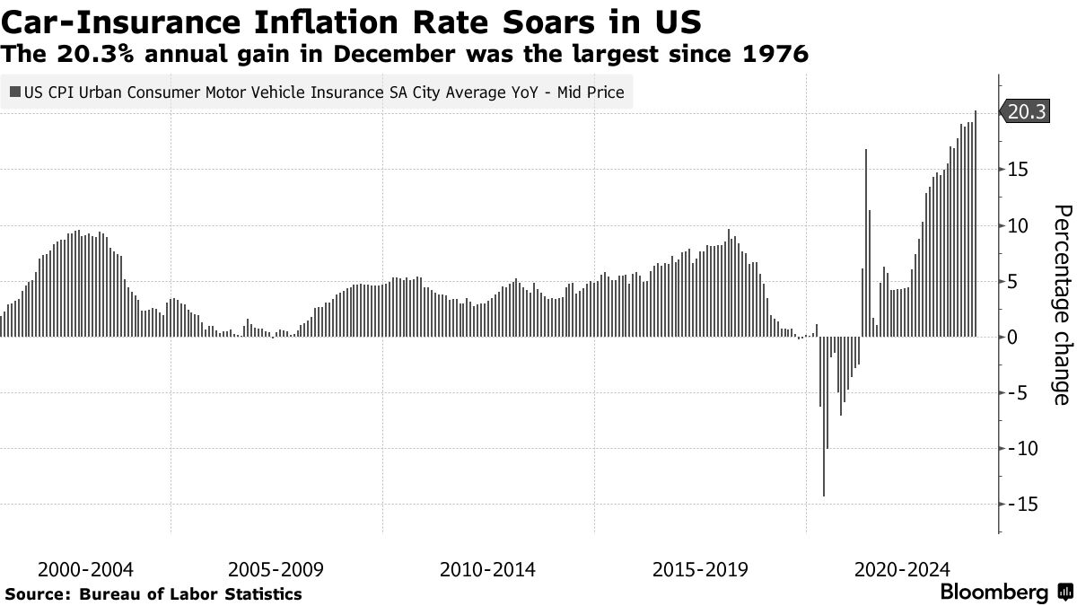 根据劳工统计局的数据,汽车保险价格比去年同期上涨了20.3%,这是自1976年以来的最大涨幅,也是连续第16个月年度涨幅超过10%。