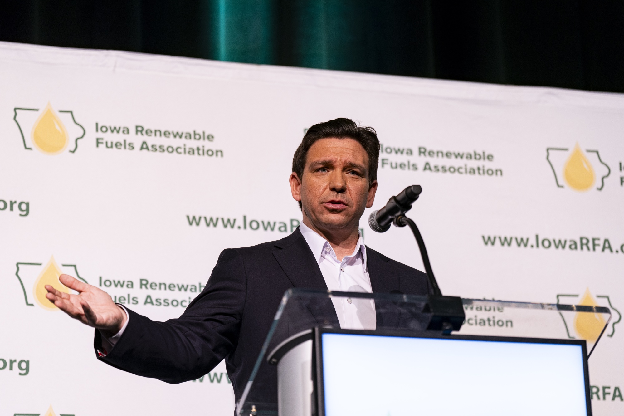 罗恩·德桑特斯在爱荷华州阿尔图纳举行的爱荷华可再生燃料协会峰会上,于1月11日。