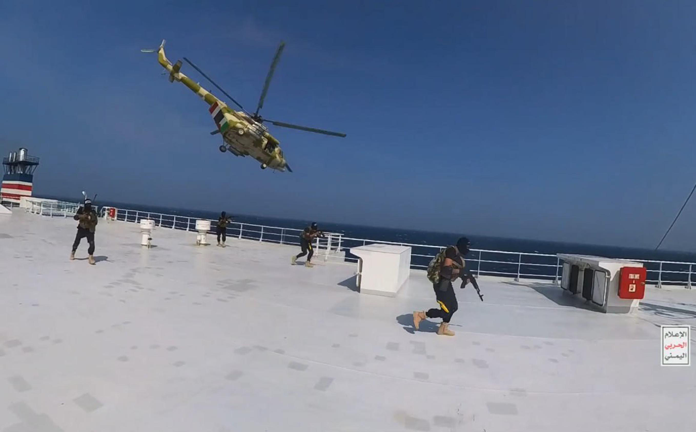 国际水域红海,也门 - 2023年11月20日:这是从视频中捕获的一张手稿截图,显示也门胡塞武装分子在胡代达以外的红海海岸接管了“银河领袖”货船摄影师:手稿/盖蒂图片欧洲美国和英国对也门胡塞叛军目标发动了空袭,升级了与伊朗代理人的冲突,以回应一系列干扰红海商业航运的袭击。