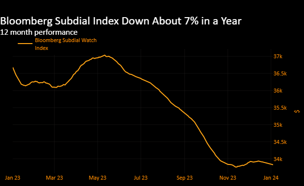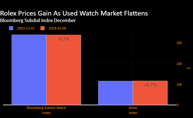 追踪交易价值最高的50款瑞士手表的彭博Subdial手表指数在12月持平,而劳力士型号的指数上涨约0.7%。