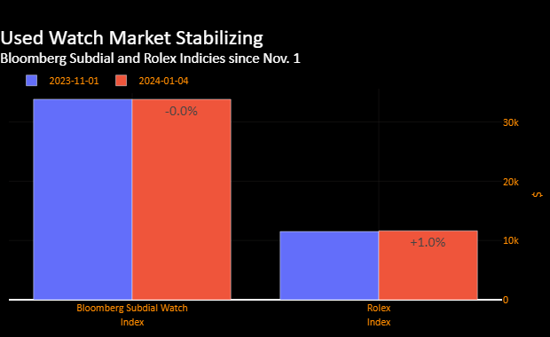 这表明二手奢侈手表的价格可能停止下跌。在疫情期间,现金充裕的消费者在家中抢购劳力士、百達翡麗和爱彼等品牌的炒作型号,导致价格飙升。但随着利率上升和加密货币价值下跌,价格在2022年4月急剧下跌。彭博Subdial手表指数在11月创下两年新低。