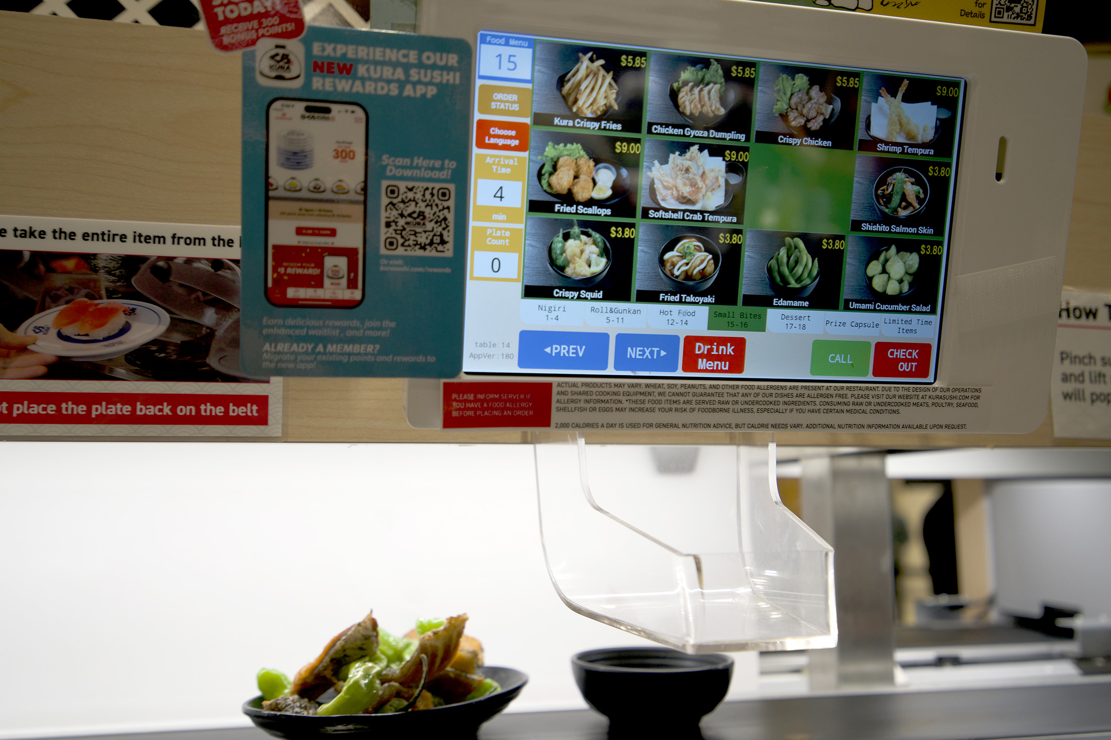 朗说,Kura的价格大约是典型美国寿司餐厅的一半。以每份3.20到3.85美元的价格,顾客可以选择盘子上有两片寿司、一片海胆或帝王蟹等稀有食材,或者带有酱汁和炸碎的色彩缤纷的卷物。