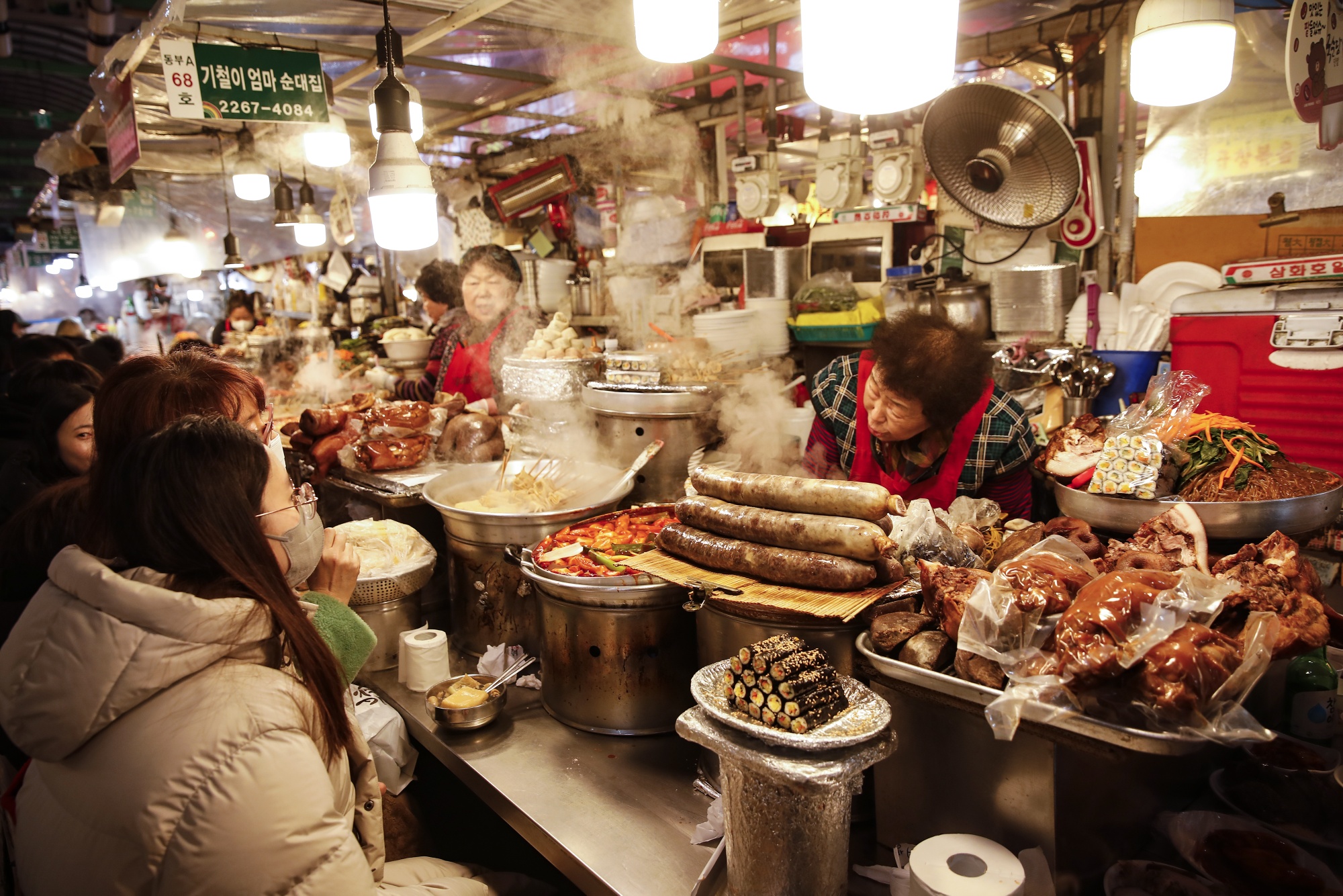 供应商在韩国首尔的广藏市场的一个摊位上准备食物,2023年12月16日。