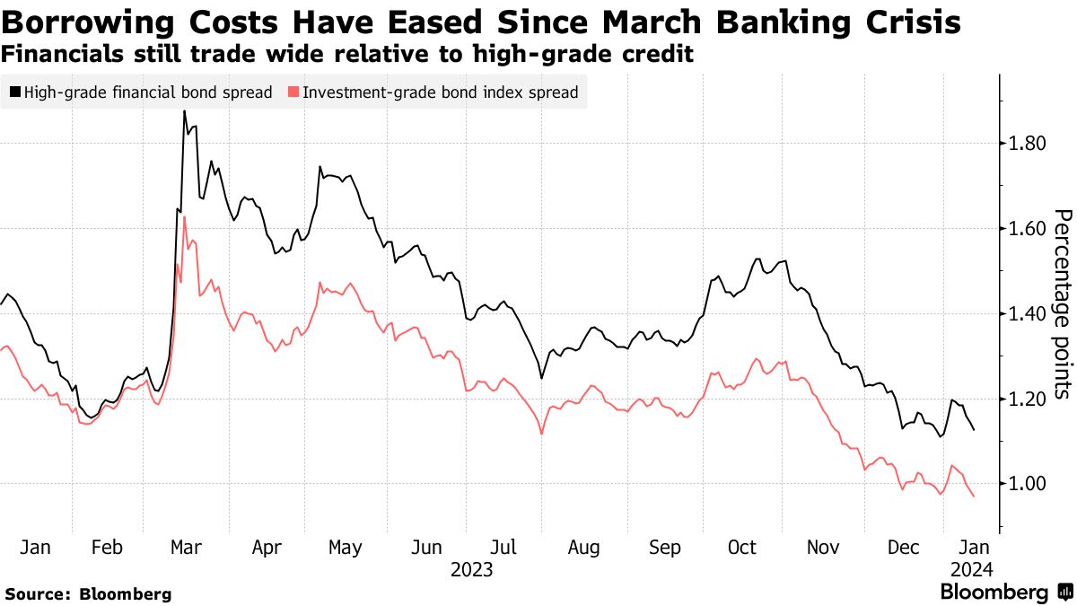 尽管交易员预计美联储今年将开始降息,但在未来几个月内,基准借贷成本不太可能大幅下降。根据彭博汇编的数据,与早在2023年初的地区银行动荡相比,投资者要求持有蓝筹金融债券相对于美国国债的额外收益已经减少。